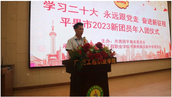 新团员代表龚奕鸣也分享了自己的体验和感受,表达了自己加入共青团的决心和信心。 广西工程职业学院平果附属实验中学党支部书记、副校长覃清香讲话,覃副校长对新入团团员表示祝贺,并对新团员们提出了四点要求,一、希望青年同志们加倍珍惜青春年华,勤奋学习,努力学习一切对报效祖国、服务人民、奉献社会、健康成长有用的知识,充分发挥团员模范带头作用,不断提高自身的综合素质,不断增强为祖国和人民服务的本领。二、增强责任意识,敢于担当。加入共青团,并不只代表着荣誉,更是一种责任!关注细节,从我做起,自觉遵守中学生行为规范,不参与任何违纪违规行为,维护校园文明和谐;积极主动做事,发挥先锋模范作用。三、加强道德修养,做一个有道德的青少年。 “少年兴则国家兴,少年强则国家强。” 一个国家的希望就寄托在青少年的身上。自觉学习和践行社会主义核心价值观,多做关心集体、热心公益、扶贫济困、见义勇为的好事,真正尽到新时代青少年的责任和义务,以自己的行动影响和带动更多的人。四、牢记今天的入团誓词,忠实地履行自己的诺言;以强烈的责任感来体现共青团的先进性和模范性;希望你们增强团员意识,保障和维护团员的基本权利,明确团员的各项义务,提高团员对团组织的认同感和归属感,切实增强组织意识;提高团员的责任感和使命感,切实增强模范意识。同时希望他们可以在未来的学习和生活中,始终保持共青团员的优良传统和作风。“优秀共青团员”韦显敏(中)、韦杰(右)